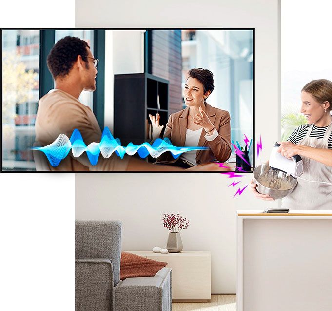 Nie daj sobie przeszkodzić, usłysz każde słowo. Kiedy w otoczeniu TV pojawią się zakłócenia, nie musisz zwiększać głośności, aby usłyszeć dialogi. Aktywny Wzmacniacz Głosu zrobi to za Ciebie. Funkcja wychwyci niepożądane dźwięki, takie jak pracujący mikser czy odkurzacz, i automatycznie wzmocni dźwięk dialogów w oglądanym materiale.