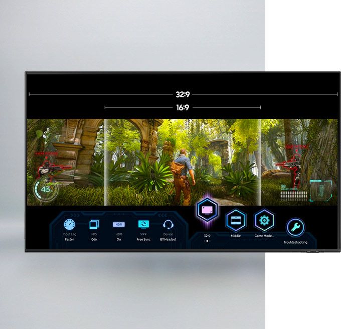 Zobacz więcej i doświadczaj bardziej swoich ulubionych produkcji z Ultra Szerokim Widokiem w Grach dzięki proporcjom obrazu 21:9 lub 32:9, podobnie jak w ultra szerokich monitorach dla graczy.