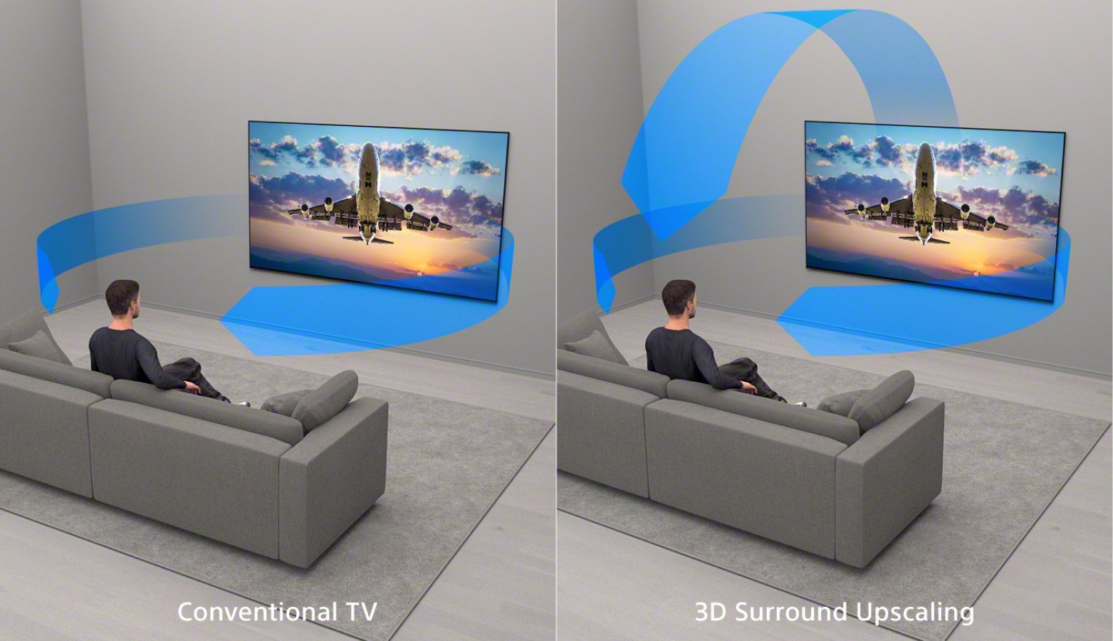 Nasz system 3D Surround Upscaling tworzy wirtualny dźwięk przestrzenny dochodzący z góry i z boków, wykorzystując wyłącznie głośniki telewizora. Nawet dźwięk 2-kanałowy i 5.1-kanałowy może zostać rozszerzony do imponującego dźwięku 5.1.2. Ponadto obsługa Dolby Atmos® i DTS:X zapewnia niezapomniany dźwięk przestrzenny.