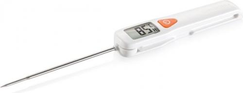 Mierzy temperaturę potraw i napojów w przedziale od - 50 do 300 °C. Posiada wyświetlacz z dużymi cyframi oraz składany czujnik ze stali nierdzewnej ułatwiający przechowywanie. Odporny na parę i wilgoć. W zestawie 3V bateria litowa. Gwarancja 3- letnia.
