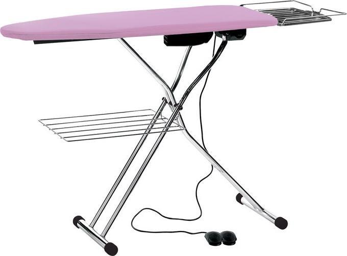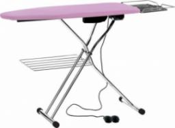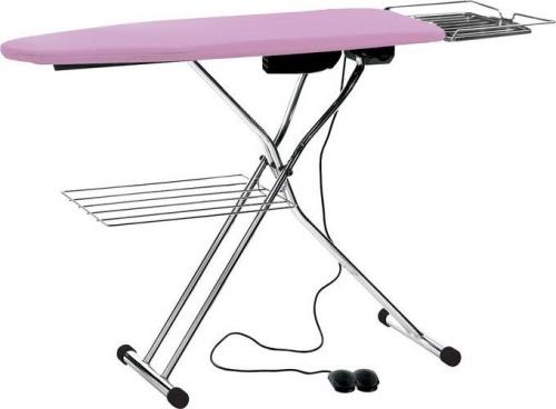 Składany, chromowany stół prasowalniczy typu deska (45x120 cm) z wyposażeniem: odsysanie i nadmuch 40W, podgrzewana powierzchnia 400W, regulacja wysokości, półka do odstawiania żelazka lub małej wytwornicy. Napięcie 230V, waga 18,5 kg, wymiary stołu gotowego do pracy 152x46x91 cm, wymiary stołu po złożeniu 165x46x13 cm.