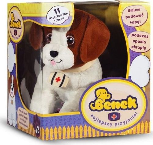 Interaktywny piesek Benek, wykonany z miękkiego, miłego w dotyku pluszu/ Wykonuje aż 11 różnych fukcji oraz wydaje 3 różne dźwięki - szczeka, chrapie, skamle. umie podać łapę porusza ogonkiem i łapami miauczy jak prawdziwy kot jeśli zostanie sam na długo, zacznie miauczeć położy się po naciśnięciu na jego lewe ucho poda lewą łapę, gdy naciśniesz jego prawe ucho zasypia, gdy leży na plecach pogłaskany po plecach kładzie się, porusza głową i mruczy z zadowoleniem