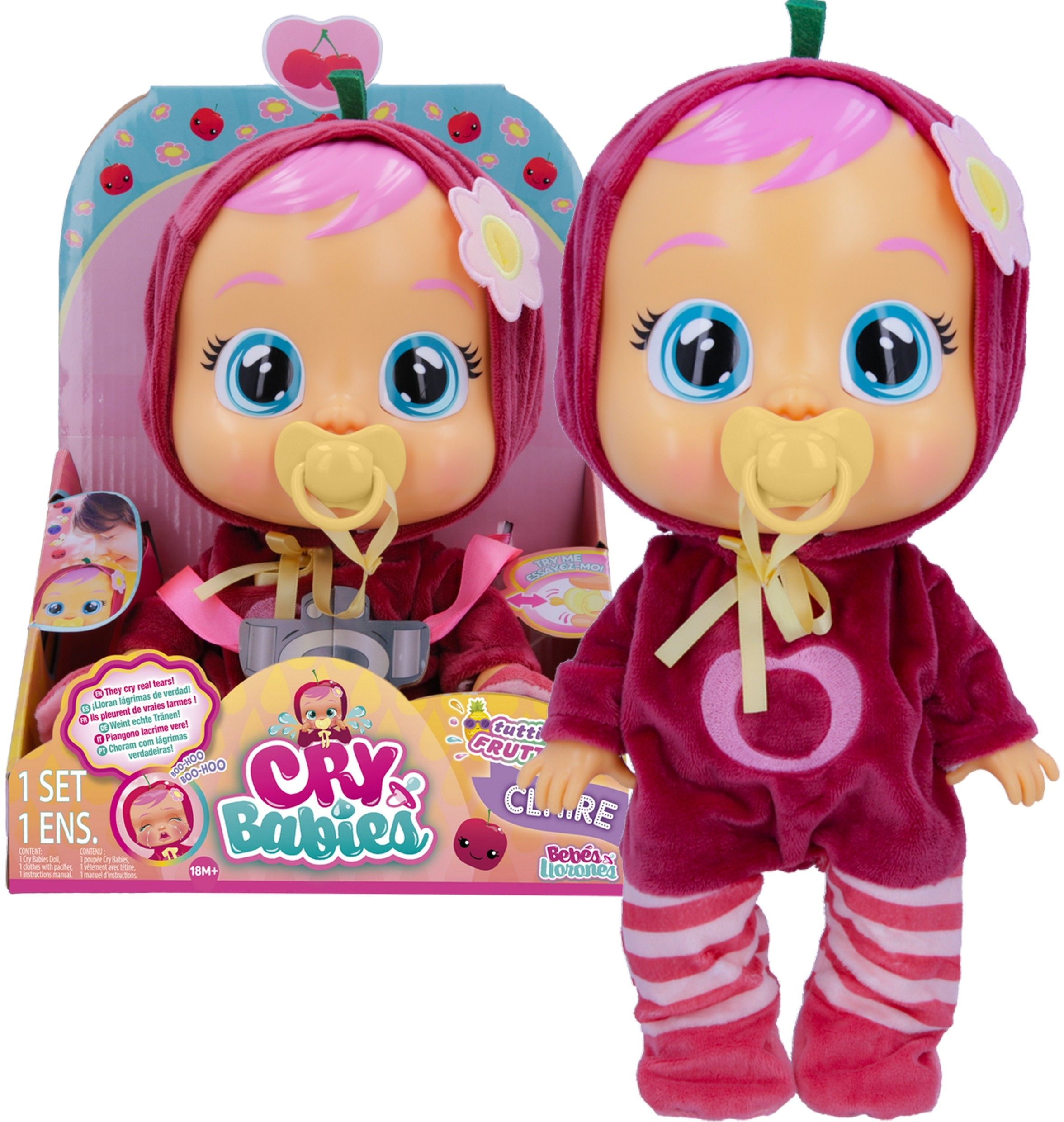 Te 30 cm lalki zachowują się jak prawdziwe bobasy! Płaczą prawdziwymi łzami imitując przy tym płacz dziecka (z tyłu głowy znajduje się pojemnik na wodę). Nowa seria to owocowy zawrót głowy, lalki swoimi piżamkami nawiązują do owoców: truskawki, arbuza, ananasa, banana, wiśni oraz jeżyny, przez co wyglądają niesamowicie! Dodatkowo każda z nich ma swój dedykowany owocowy zapach. Mimo nowego wyglądu i funkcji w dalszym ciągu potrzebują troskliwej opieki. Płaczącą lalkę uspokaja tylko podanie smoczka i przytulenie. Cry Babies uczą opiekuńczości i troski, a szeroka gama produktów daje możliwość znalezienia swojej wymarzonej lalki! Nowe przygody postaci Cry Babies Tutti Frutti, dzieci mogą śledzić w serii bajek na kanale YouTube: Cry Babies Polska.