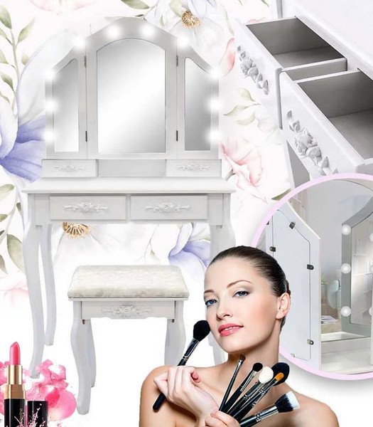 Mebel wykonany jest z płyty MDF w eleganckim białym kolorze, co nadaje mu nowoczesny charakter. Duże lustro w formie tryptyku pozwala na precyzyjne wykonanie makijażu z różnych kątów, a kwiatowe akcenty w szufladkach dodają całości uroku i stylu.