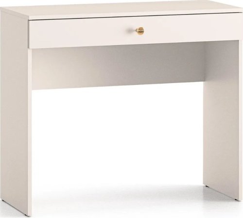 Nowoczesna toaletka MELLANIE z szufladą do sypialni Toaletka MELLANIE jest niezwykle eleganckim meblem wykonanym z bardzo trwałej płyty laminowanej w kolorze kaszmirowym, a w połączeniu z obrzeżami ABS, które podnoszą estetykę mebla, jest solidna, odporna na uszkodzenia mechaniczne, ścieranie i zarysowania. Kolor kaszmirowy nadaje niezwykłej głębi, tworząc wrażenie, że toaletka jest miejscem spokoju i wytchnienia, a sam odcień pozostaje neutralnie modny bez względu na szybko zmieniające się trendy. Złoty uchwyt jest idealny dla wielbicieli minimalistycznych wnętrz, ten mały element kluczowo wpływa na prezentację całej toaletki i sprawia, że ona jest zdecydowanie bardziej interesująca dla oka. Toaletka wyposażona jest w blat z maksymalnym obciążeniem 10 kg oraz szufladę, która dzięki zwiększonej ładowności pomieści zdecydowanie więcej kosmetyków lub biżuterii niż tradycyjna alternatywa tego elementu. Toaletka do sypialni jest doskonałym uzupełnieniem wnętrza, prezentuje się wyjątkowo pięknie i jest bardzo praktyczna, jednocześnie tworzy przestrzeń stworzoną z myślą o chwili dla siebie. Cechy produktu elegancka toaletka do sypialni, korpus z płyty laminowanej o kaszmirowej barwie, obrzeża oklejone ABS, uchwyt w złotym kolorze, blat o maksymalnym obciążeniu 10kg, szuflada na ukrytych prowadnicach, maksymalne obciążenie szuflady 5kg do samodzielnego montażu, w swojej ofercie posiadamy szeroki wybór mebli pozwalających na kompleksowe wyposażenie mieszkania.