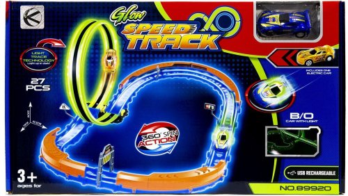 Świecący tor samochodowy to idealny pomysł na na prezent dla najmłodszych miłośników wyścigów samochodowych. Produkt jest łatwy w złożeniu i zapewni długie godziny wspaniałej zabawy. Zestaw składa się z toru liczącego 27 elementów oraz 1 auta (7 cm) ze światłami. Dodatkową atrakcją są fluorescencyjne elementy, które są podświetlane przez lampki samochodu jeżdżącego po torze.