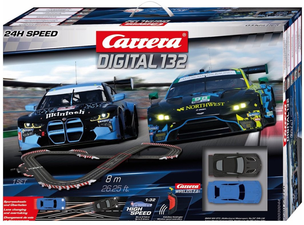 Przygotuj się na ekscytujące wyścigi z zestawem Carrera DIGITAL 132 "24H Speed". To doskonała propozycja dla miłośników motorsportu, która umożliwia rywalizację aż do 6 kierowców jednocześnie. Dzięki realistycznym modelom samochodów wyścigowych, takim jak Ferrari 296 GT3 i Aston Martin Vantage GT3, przeniesiesz się na tor wyścigowy prosto z własnego salonu.