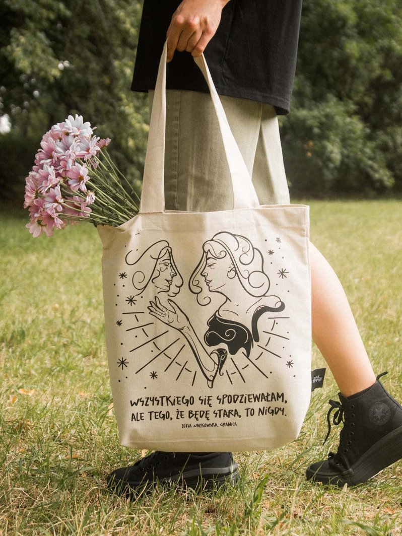 Torba została zaprojektowana przez Zofię Nałkowską, a jej nadruk wykonany jest nowoczesną metodą cyfrową (DTF), co zapewnia wysoką jakość i trwałość. Materiał bawełniany jest łatwy w pielęgnacji, co dodatkowo podnosi jej wartość użytkową.