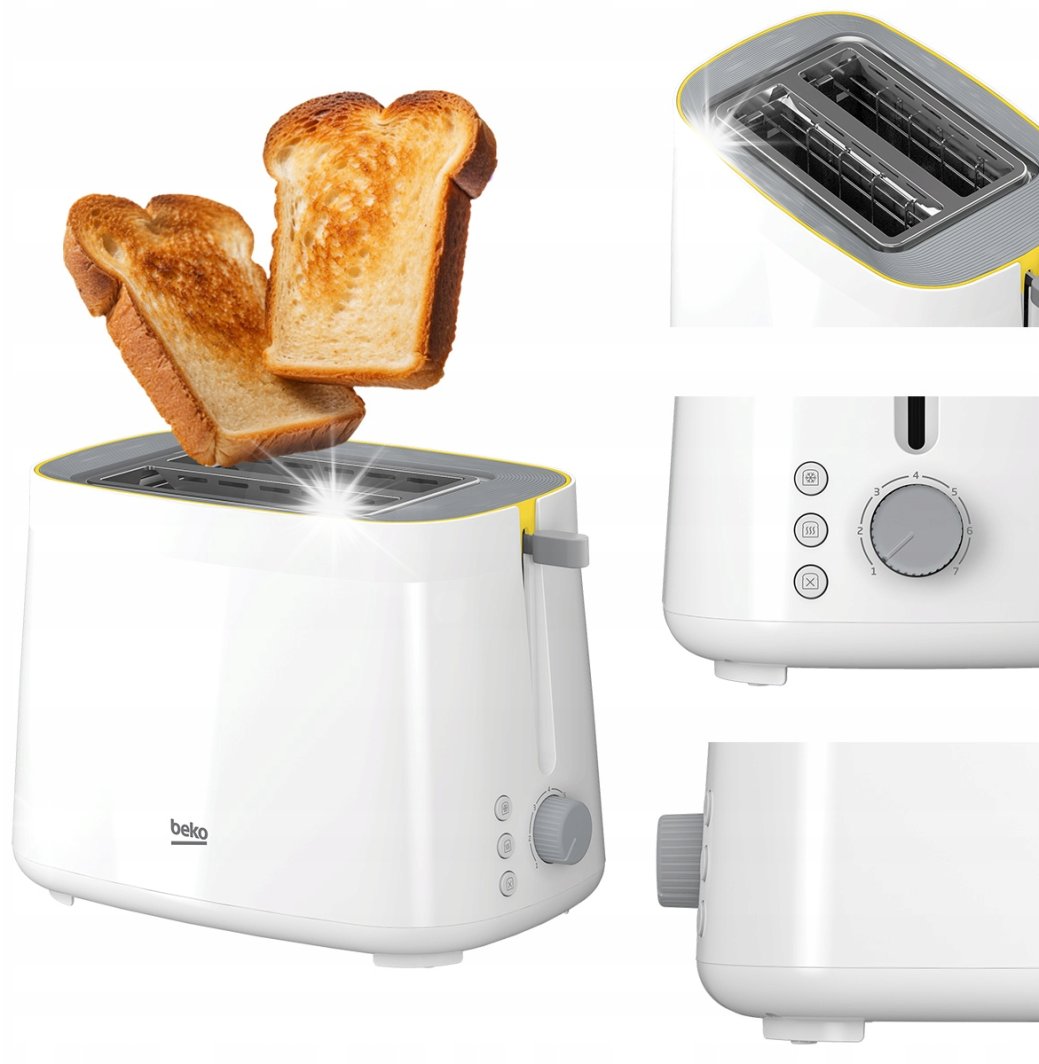 Toster Beko TAM 4220W charakteryzuje się termoizolowaną obudową, co zapewnia bezpieczeństwo podczas użytkowania. Dodatkowo, urządzenie posiada automatyczne wyłączanie po zakończeniu opiekania, co minimalizuje ryzyko przypadkowego przegrzania. Wysokie podnoszenie tostów umożliwia łatwy dostęp do gotowych tostów, a wyjmowana tacka na okruchy ułatwia czyszczenie.