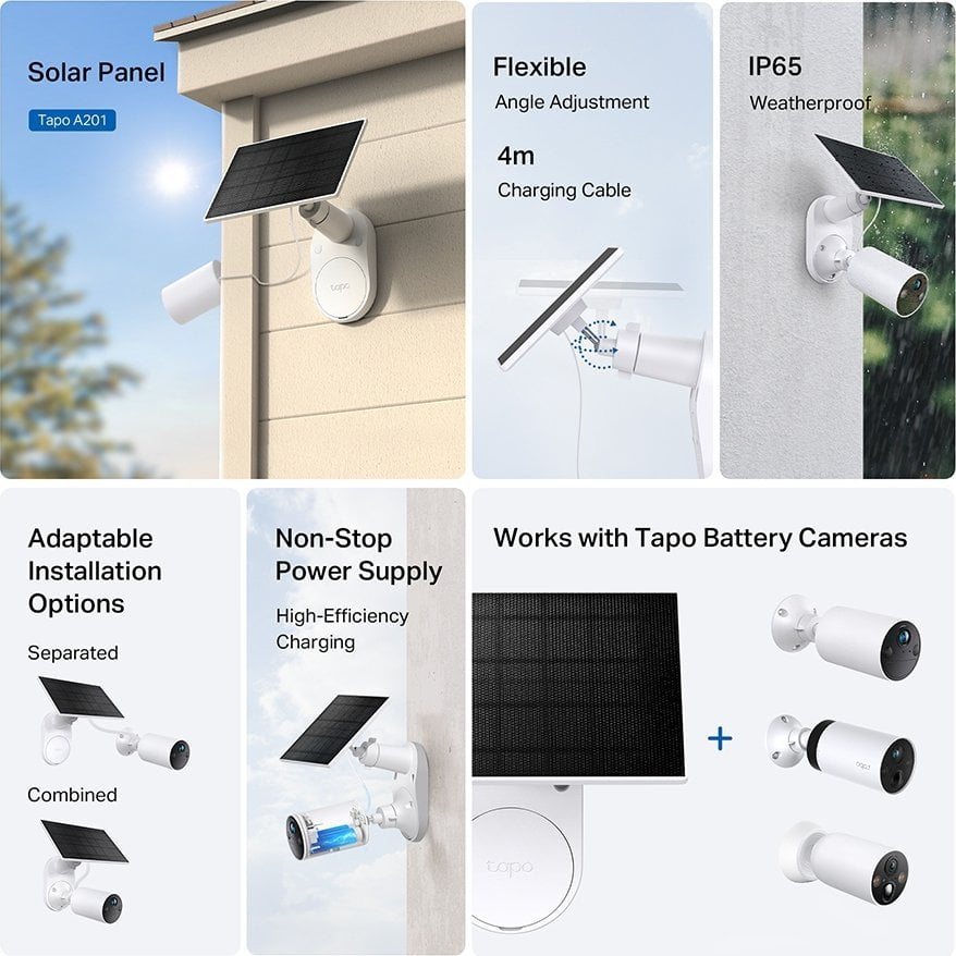 Niezależnie od pogody, panel Tapo A201 jest gotowy do pracy. Posiada certyfikat odporności IP65, co gwarantuje pełną ochronę przed deszczem i kurzem. Dołączony do zestawu regulowany uchwyt pozwala na precyzyjne ustawienie kąta nachylenia panelu, aby maksymalnie wykorzystać dostępne światło słoneczne. Dzięki długiemu, 4-metrowemu kablowi, masz pełną swobodę w wyborze miejsca montażu – możesz zainstalować go bezpośrednio przy kamerze lub w bardziej nasłonecznionym miejscu, aby zapewnić optymalne ładowanie.