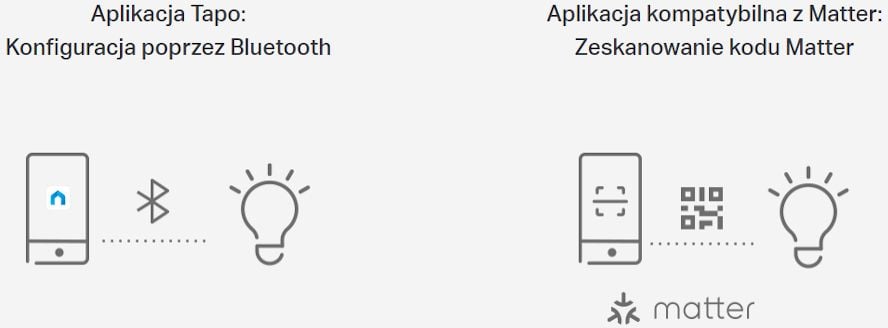 Tapo oferuje użytkownikom wiele możliwości, aby uprościć proces konfiguracji. Użyj Bluetooth, w celu konfiguracji Żarówki Smart korzystając z aplikacji Tapo. Możesz również zeskanować kod Tapo L535E, na dowolnej aplikacji kompatybilnej z Matter, takiej jak na przykład Alexa, Google Home i Apple Home.
