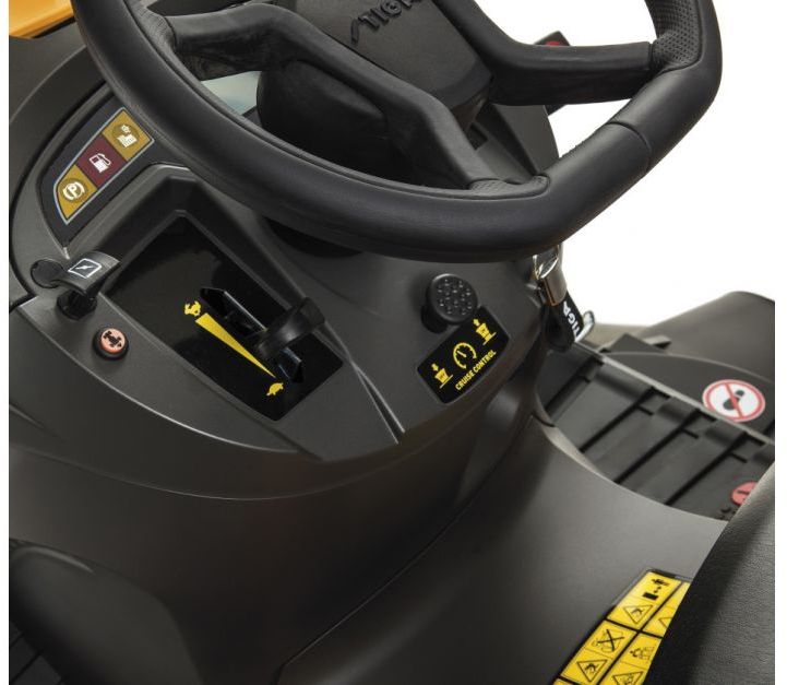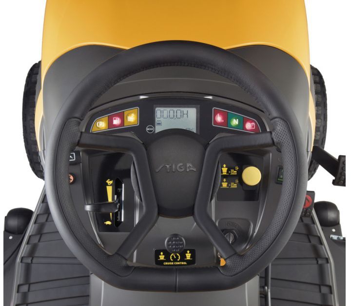 Traktor posiada komfortowy fotel z wysokim oparciem i podłokietnikami oraz wyłącznik bezpieczeństwa, który automatycznie wyłącza silnik oraz urządzenie tnące, jeżeli użytkownik opuści fotel. Przyjemna w dotyku, miękka kierownica zapewnia wygodę podczas manewrowania urządzeniem. Wielofunkcyjny wyświetlacz ułatwia monitorowanie wskaźników działania. Przednie światła LED pozwalają na precyzyjną pracę nawet po zmroku - wydajne koszenie bez ograniczeń.