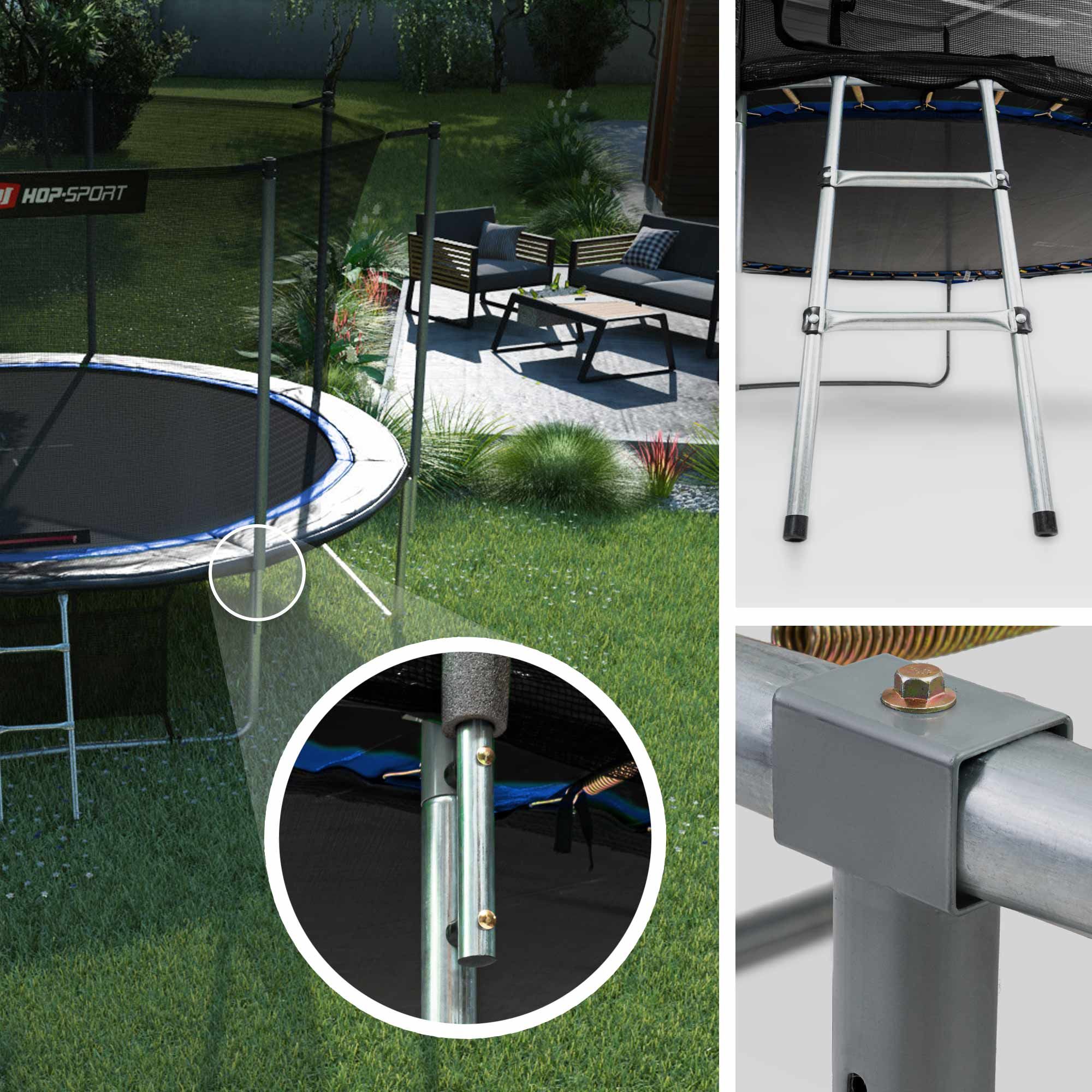 Wszystkie elementy konstrukcyjne trampoliny ogrodowej marki Hop-Sport wykonano z wysokiej jakości stali hartowanej, ocynkowanej i galwanizowanej, co zapewnia trwałość trampoliny przez wiele sezonów oraz skuteczną ochronę konstrukcji przed korozją i niszczeniem. Poszczególne elementy łączy się ze sobą za pomocą długich śrub. Stelaż trampoliny tworzą 5 podwójnych nóg w kształcie litery “U”. Wykonane zostały z wysokiej jakości stali. Ich zadaniem jest stabilizowanie całej konstrukcji i zapewnienie bezpieczeństwa nawet podczas bardzo intensywnych zabaw/skoków.