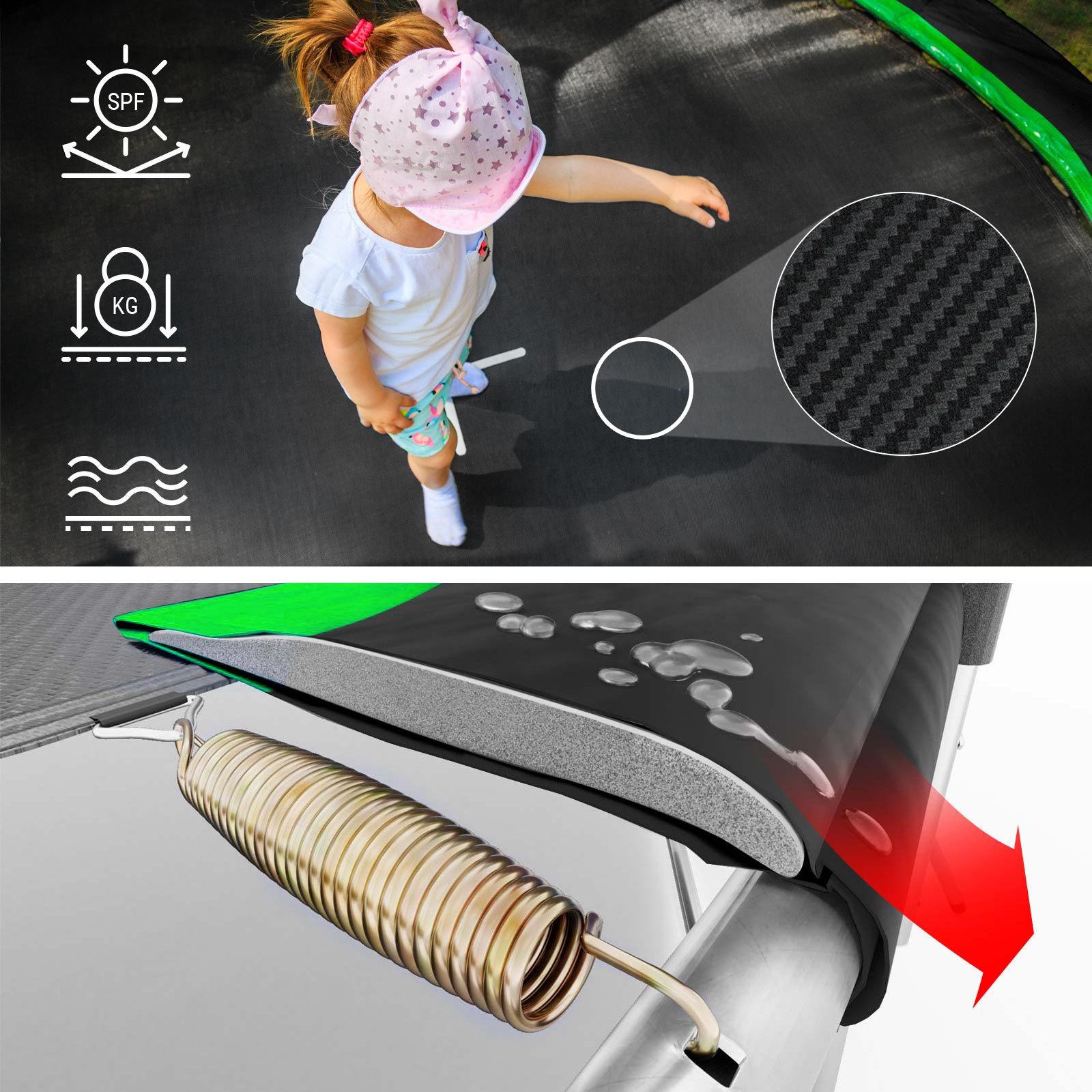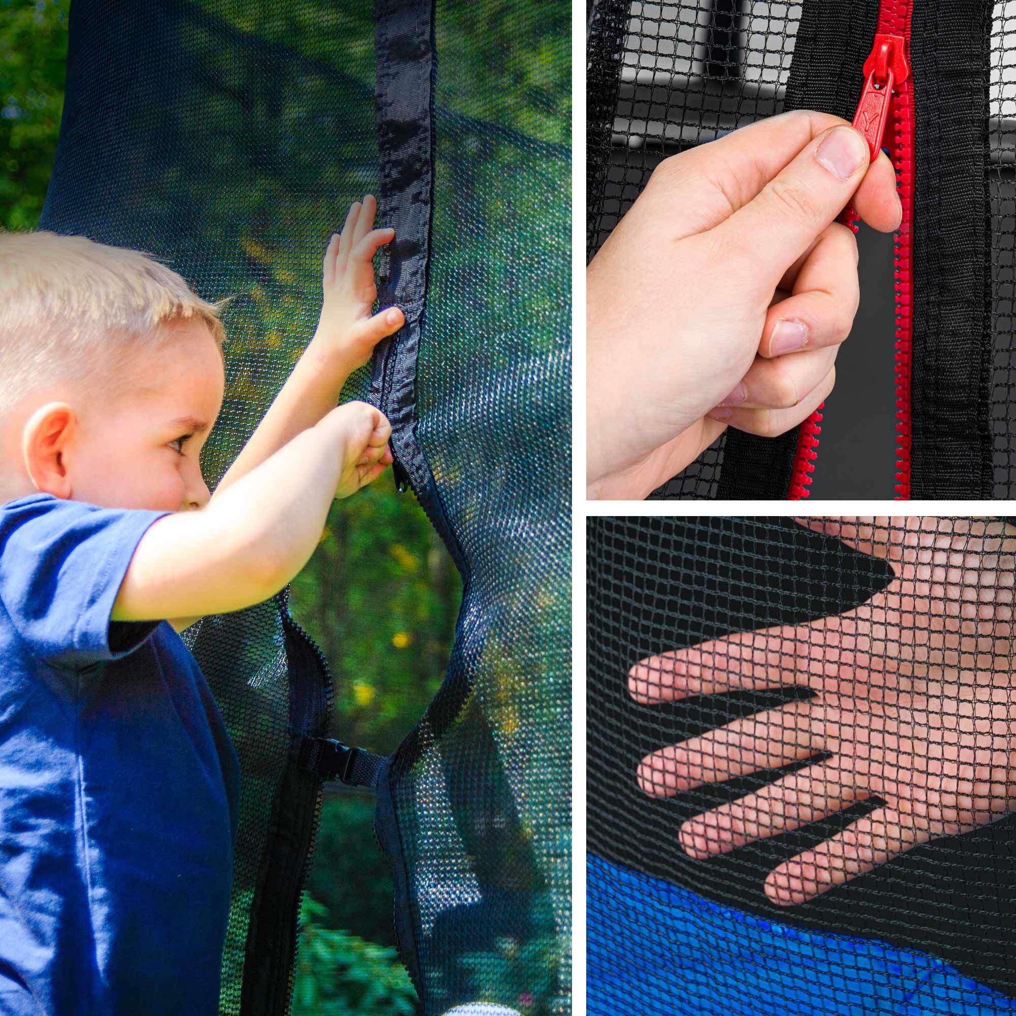 Siatka trampoliny wykonana została z wysokiej jakości polietylenu. Materiał ma gęsty i wytrzymały splot (100g/m2), który gwarantuje bezpieczeństwo nawet podczas intensywnej zabawy. Dodatkowo, zamek posiada inny kolor, niż siatka, co znacznie ułatwia dzieciom zlokalizowanie wyjścia. Zamek błyskawiczny jest w kształcie litery “L” i jest zabezpieczony dodatkowymi zatrzaskami, dzięki czemu masz pewność, że nie rozsunie się w trakcie zabawy.