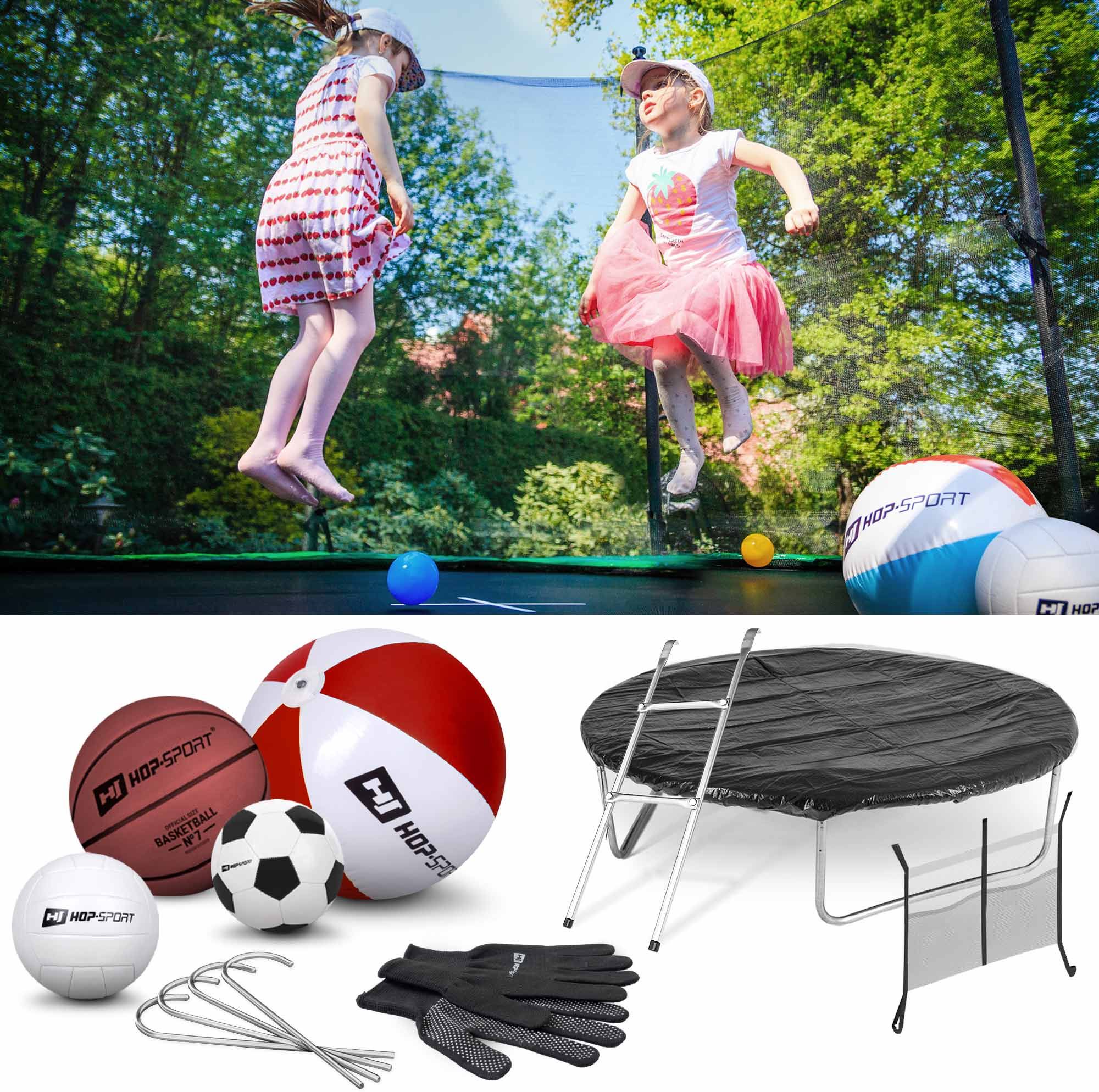 Elementem, który decyduje o wysokich skokach są sprężyny. W tym modelu zastosowano 100 solidnych sprężyn o gęstym splocie. Prawidłowo zainstalowane sprężyny nie wysuną się podczas zabawy lub treningu. Sprężyny w trampolinie marki Hop-Sport zostały okryte dwuwarstwowym materiałem wypełnionym gąbką.