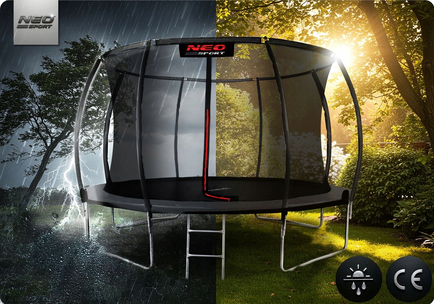 Stelaż trampoliny NEO SPORT został wykonany z wysokiej jakości stalowych rurek, odpornych na korozję, promieniowanie UV i intensywne użytkowanie.