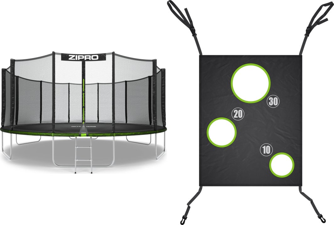 Trampolina ZIPRO przynosi wiele dobrej zabawy dla młodszych i starszych użytkowników. Dodatkowe akcesoria mogą jednak jeszcze bardziej urozmaicić czas. Specjalna mata zaczepiana do słupków zamieni trampolinę w prawdziwe centrum rozrywki! Akcesorium ma trzy otwory o różnych wielkościach, które mają służyć jako cel do rzucania lub kopania w nie piłką. Jest to m.in. idealna atrakcja dla małych piłkarzy – trenuj, zdobywaj punkty, wymyślaj własne gry i przede wszystkim postaw na beztroską zabawę!