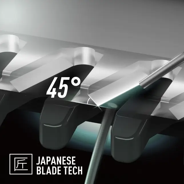 W celu zapewnienia doskonałego efektu trymer wyposażono w ostrza ze stali nierdzewnej z nanoszlifem o kącie 45°, wykonane przy użyciu najnowszej japońskiej technologii ostrzy. Trwałe i ostre krawędzie tnące z łatwością radzą sobie z każdym rodzajem włosów — od cienkich i niesfornych po grube i gęste.
