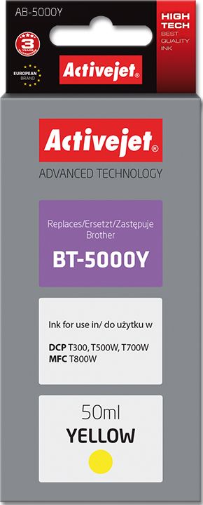 Tusz w wersji Supreme kompatybilny z urządzeniami drukującymi Brother zamiennik modelu Brother BT-5000Y. Produkt o zwiększonej pojemności 50 ml Yellow, objęty 5-letnim okresem gwarancji.