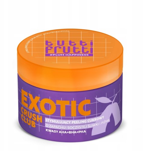 TUTTI FRUTTI #PlumHappiness to niezwykły peeling cukrowy, który łączy mechaniczne złuszczanie z nowoczesnymi kompleksami kwasów AHA, BHA oraz PHA. Dzięki tej innowacyjnej formule, peeling skutecznie eliminuje martwe komórki naskórka, pozostawiając skórę gładką, elastyczną i promienną.