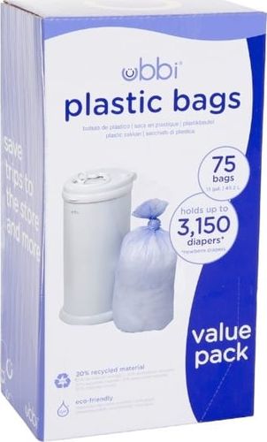 Ubbi Worki do Kosza 50 l 75 szt. Worki na śmieci Ubbi wykonane są w 20% z materiałów pochodzących z recyklingu. Ze swą 50 l pojemnością idealnie pasują do stalowych koszy na pieluchy Ubbi, choć nie są do nich wymagane. Możesz ich używać na co dzień. Także w parze z Twoim tradycyjnym koszem na śmieci. Cechy: 75 worków o pojemności 50 l, wykonane w 20% z materiałów pochodzących z recyklingu, idealnie pasują do koszy na pieluchy Ubbi, mogą być używane z innymi koszami na śmieci.