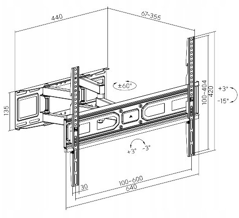Uchwyt oferuje możliwość regulacji nachylenia w pionie (+3° / -15°) oraz obrotu w poziomie do 60°. Dzięki temu możesz łatwo dostosować kąt widzenia, co zapewnia komfort podczas oglądania ulubionych programów czy filmów.