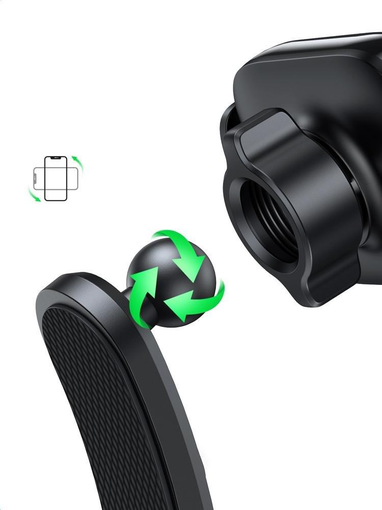 Uchwyt nie wymaga dopasowywania do rozmiaru telefonu. Wystarczy odłożyć na niego urządzenie - resztą zajmą się regulowane szczęki. Okrągła gałka umożliwia swobodny obrót smartfona pod kątem 360°C, dzięki czemu użytkownik ma możliwość dowolnego ułożenia sprzętu.
