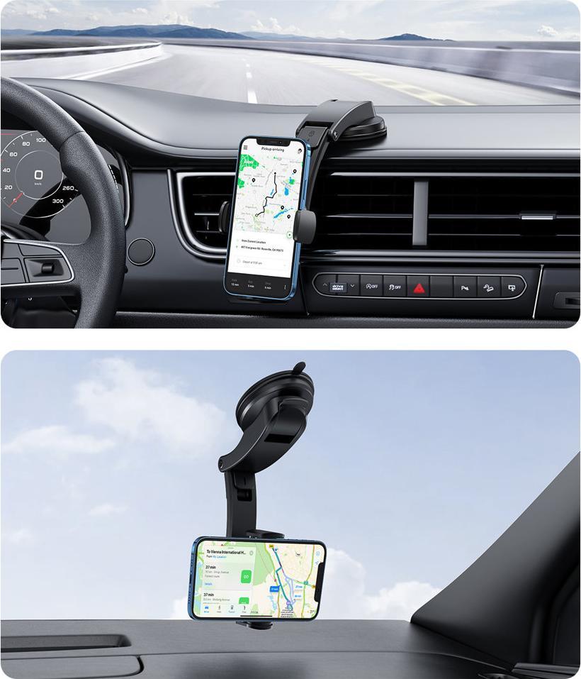 Uchwyt samochodowy montowany desce rozdzielczej auta. Gadżet jest łatwy w obsłudze, wystarczy odłożyć na niego telefon i zacisnąć szczęki, by ten został ustabilizowany w wybranej pozycji. Duży zakres regulacji oraz gumowe nakładki chroniące przed zarysowaniem stanowią jego cenne atuty, które doceni każdy użytkownik.