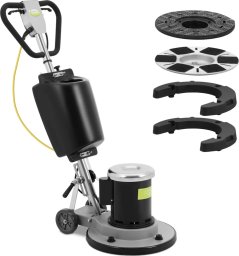 Polerka do podłóg marki ulsonix pozwoli szybko i skutecznie wyczyścić szeroką gamę podłóg, takich jak płytki, PVC, marmur, drewno czy linoleum. Urządzenie sprawdzi się w takich miejscach jak w hotele, supermarkety, czy budynki biurowe. W razie potrzeby można użyć maszyny do polerowania, aby nadać blasku podłodze. Polerka do parkietu jest prosta w obsłudze i gotowa do użytku zaraz po złożeniu. Po napełnieniu zbiornika płynem czyszczącym należy ustawić kąt uchwytu sterującego, tak aby zatrzasnął się między kolanami a biodrami. Dzięki regulowanej wysokości rączki maszyna może być z łatwością obsługiwana zarówno przez wysokie, jak i niskie osoby. Gdy uchwyt znajdzie się na wygodnej wysokości roboczej, jednym naciśnięciem przycisku uruchamia się mocny silnik 1864 W. Po naciśnięciu obu dźwigni polerka jednotarczowa ruszy. Należy zwolnić dźwignię, aby maszyna zatrzymała się. Polerka jest kompaktowa, więc można nią łatwo manewrować nawet w ciasnych przestrzeniach. Ciężkie żelazne płyty obciążają urządzenie, dzięki czemu bezpiecznie i spokojnie przesuwa się po podłodze. Prędkość do 175 obr./min sprawia, że maszyna usuwa nawet uporczywy brud. Dopasowane podkładki czyszczące łatwo przymocować do urządzenia. Pozwala to na wygodne dostosowanie sprzętu do różnych podłóg. Przewód zasilający o długości 13 m pozwoli swobodnie poruszać się po dużych pomieszczeniach czy długich korytarzach.
