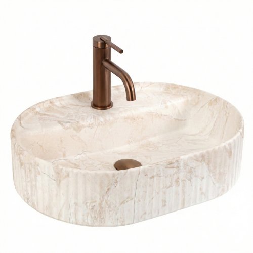 Umywalka nablatowa Rea Marcela 50 Saturn to stylowy i nowoczesny element, który doskonale wzbogaci Twoją łazienkę. Stworzona z myślą o osobach, które cenią sobie wyrazisty design oraz stonowaną paletę kolorów, umywalka o lekko wydłużonym, owalnym kształcie emanuje lekkością i nowoczesnością. Dodatkowo, dekoracyjne pionowe żłobienia na zewnętrznych ściankach nadają jej unikalnego charakteru architektonicznego.