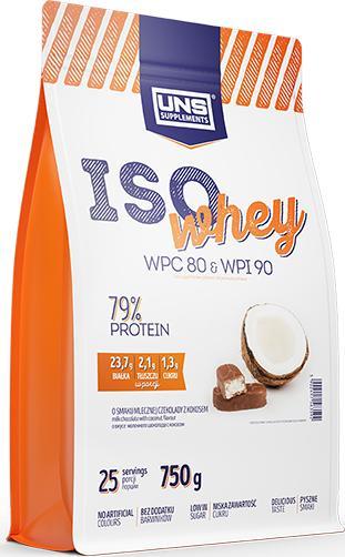 Dlaczego warto wybrać białko UNS Iso Whey?Numer jeden wśród osób szukających wysokiej klasy białka.Kremowa i lekka konsystencja.Natychmiastowa rozpuszczalność.Wyszukane i dopracowane warianty smakowe.Zawiera dodatek izolatu białka serwatkowego.Słodzone jedynie sukralozą, nie zawiera dodatku cukru.Bez dodatku barwników, wypełniaczy.Idealny wybór białka dla osób planujących redukcje tkanki tłuszczowej.Odżywki białkowe a odchudzanieOdżywki białkowe skutecznie wspomagają odchudzanie, ponieważ dostarczane do organizmu proteiny zwiększają metabolizm nawet o 30%. Ponad to białko zwiększa uczucie sytości, tym samym hamuje apetyt i ogranicza ilość przyjmowanych kalorii, co przekłada się budowanie beztłuszczowej masy ciała i redukcję tkanki tłuszczowej. Stosowanie odżywek białkowych zapewnia dostarczenie dużej ilości protein przy małej ilości węglowodanów. Na trawienie protein organizm potrzebuje większej ilości energii niż jej one dostarczają, na strawienie 1g białek, które dostarcza 4 kcal, konieczne jest zużycie 24 kcal, co powoduje wzrost termogenezy po posiłkowej. Oprócz tego powodują obniżenie poziomu insuliny.Odżywki białkowe a budowa masy ciałaBiałko jest podstawowym budulcem mięśni. Odżywki białkowe dostarczają do organizmu łatwo przyswajalne proteiny, zawierające wszystkie potrzebne aminokwasy, szczególnie aminokwasy BCAA, które są istotne w procesach anabolicznych i regeneracji po treningu. Niedobór białek może być przyczyną mniejszych przyrostów masy mięśniowej, dlatego ważna jest ich odpowiednia podaż. Podczas intensywnego wysiłku fizycznego zwiększa się zapotrzebowanie na proteiny i wynosi około 2-4 gramów białka na kilogram masy ciała. Proteiny pomagają budować beztłuszczową masę mięśniową, między innymi dzięki zawartości leucyny, która ma duży wpływ na syntezę białek mięśniowych. Odżywki białkowe, właściwościIzolat białka serwatkowego (WPI), to odżywka, która zawiera nawet 90% białka, z niską zawartością węglowodanów i tłuszczu, bez zawartości laktozy. Koncentrat białka serwatkowego (WPC) zawiera 80% protein oraz węglowodany i tłuszcze. Obydwie odżywki charakteryzuje bardzo dobra przyswajalność. Są bogatym źródłem aminokwasów egzogennych. Ich stosowanie wspomaga pracę układu nerwowego, obniża poziom cholesterolu i ciśnienie, wspiera budowanie masy mięśniowej i regenerację mięśni po treningu, oraz spowalnia procesy kataboliczne, ułatwia odchudzanie i utratę tkanki tłuszczowej przyspieszając metabolizm i zwiększając uczucie sytości, działa antyoksydacyjnie. Zalety UNS Iso WheySuplement diety ISO WHEY od firmy UNS Supplements jest wysokobiałkową odżywką w postaci proszku, która służy do wzbogacenia codziennego odżywiania o pełnowartościowe proteiny serwatki. W składzie produktu wykorzystano połączenie dwóch popularnych frakcji białka serwatkowego, co zapewnia zróżnicowany czas uwalniania zawartych wartości odżywczych i odmienne tempo przyswajalności. Dzięki temu preparat gwarantuje optymalne wsparcie praktycznie o każdej porze dnia – rano, po treningu, pomiędzy posiłkami czy jako forma dodatku do kolacji. Jeżeli tylko masz na to ochotę, po prostu sięgnij po shaker i przygotuj niesamowicie białkowy koktajl!Odżywka ISO WHEY to blisko 80% pełnowartościowego koncentratu WPC (instant), który zestawiono z izolatem WPI. Tak przygotowana formuła sprawdzi się jednakowo u początkujących, jak i zaawansowanych ćwiczących. Produkt jest rekomendowany dla miłośników praktycznie wszystkich dyscyplin sportowych, którzy szukają wygodnego i szybkiego sposobu na uzupełnienie diety o proteiny serwatki. Białko stanowi jeden z kluczowych składników dla wzrostu i utrzymania aktualnej masy mięśniowej, a także wspiera zachowanie zdrowej kondycji kości. Przyjmuje się również, że regularna suplementacja białkiem serwatki sprzyja syntezie glutationu wykazującego właściwości antyoksydacyjne. Każda porcja to blisko 23,7 g proteiny serwatki o niebanalnych i wyjątkowych smakach, które przełamią rutynę w codziennej diecie. Skład odżywki ISO WHEY charakteryzuje niewielka zawartość cukru, co pozwala na wykorzystanie preparatu nie tylko w trakcie budowania masy. Produkt może okazać się korzystnym i alternatywnym źródłem protein dla osób w trakcie odchudzania i kontroli masy ciała. Nie rezygnuj ze słodkiego smaku, nawet podczas restrykcyjnej diety! Wypróbuj matriks białkowy ISO WHEY i przekonaj się o kompleksowym wsparciu dla Twojej sylwetki!Czy to białko pieni się lub pozostawia grudki?Bez względu na to czy użyjesz wody lub odtłuszczonego mleka do przygotowania produktu, odżywka dzięki instanizowanej formie białek nie powoduje problemów z rozpuszczalnością. Czy ta odżywka znajdzie zastosowanie jako dodatek do posiłków?Nie ma przeciwwskazań do użycia ISO WHEY w formie składnika np. owsianek, dietetycznych wypieków czy owocowych koktajli. Ile porcji białka mam spożyć w trakcie dnia?Całkowita ilość porcji jest nierozerwalnie związana z aktualnym zapotrzebowaniem. Firma UNS Supplement rekomenduje spożycie od 1 do 2 porcji produktu dziennie.BAD