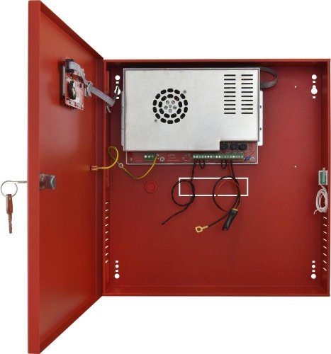Zasilacz ma kompaktowe wymiary 390 x 406 x 88 mm, co ułatwia jego instalację w różnych warunkach. Obudowa wykonana ze stali DC01 o grubości 1 mm zapewnia trwałość i odporność na uszkodzenia, a czerwony kolor (RAL 3001) sprawia, że urządzenie jest łatwe do zlokalizowania w systemach PPOŻ.