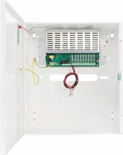 Ten zasilacz buforowy jest wyposażony w 8 wyjść po 1A każde, co umożliwia zasilanie wielu urządzeń jednocześnie. Taka elastyczność sprawia, że jest to doskonałe rozwiązanie dla różnorodnych instalacji, gdzie potrzebne jest zasilanie dla kilku komponentów.