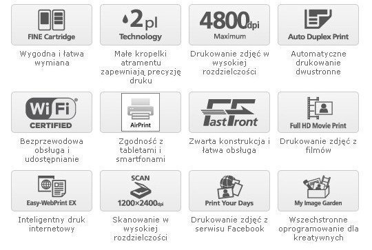 System kaset typu FINE zapewnia dużą szczegółowość obrazu i szybkość drukowania. Wysoka jakość szybkiego drukowania dokumentów i zdjęć formatu A4 (wg ISO ESAT): 9,2 obr./min w trybie monochromatycznym i 5,0 obr./min w kolorze. Czas drukowania zdjęcia formatu 10 x 15 cm bez marginesów: około 44 s. Czas kopiowania formatu A4 w kolorze: około 20 s.