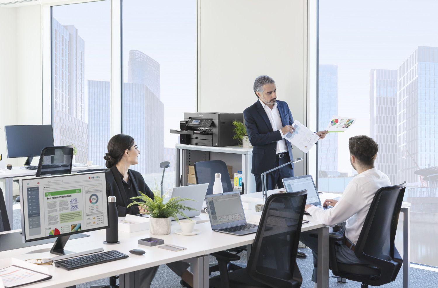 Ten bogaty w funkcje model EcoTank* pozwala błyskawicznie zrealizować zadania w formacie A3+, zapewniając przy tym niski koszt strony. Możliwe jest to dzięki dużej szybkości drukowania i skanowania, dwóm przednim podajnikom na 250 arkuszy, podajnikowi tylnemu na 50 arkuszy oraz automatycznemu podajnikowi dokumentów na 50 arkuszy w formacie A3. Drukuj, tak jak lubisz, korzystając z opcji druku mobilnego, łączności Ethernet oraz ekranu dotykowego LCD 10,9 cm z klawiszami.