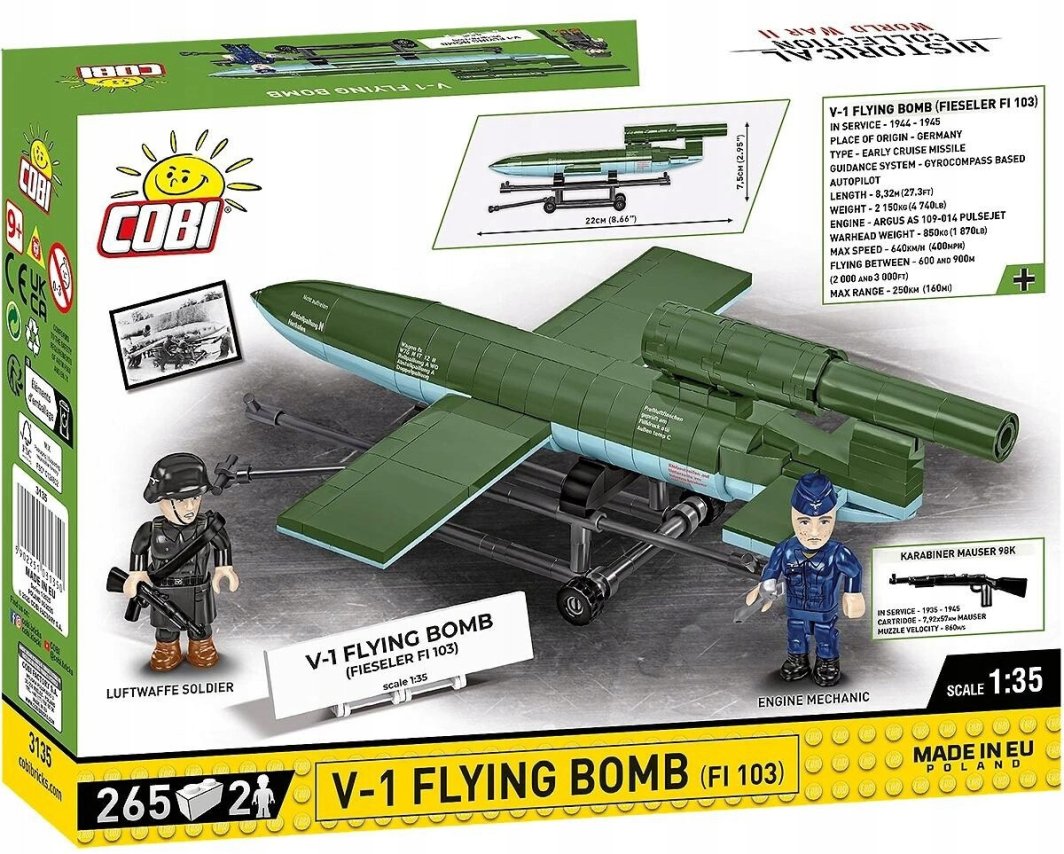 Zestaw klocków COBI 3135 V-1 Flying Bomb to niezwykły model rakiety V-1, znanej również jako "latająca bomba", w skali 1:35. Składający się z 265 elementów, ten zestaw nie tylko umożliwia zbudowanie historycznego modelu, ale także zawiera dwie figurki, które wprowadzają w fascynujący kontekst II wojny światowej. Model został starannie zaprojektowany, aby wiernie oddać charakterystyczny silnik pulsacyjny oraz aerodynamiczne skrzydła rakiety.