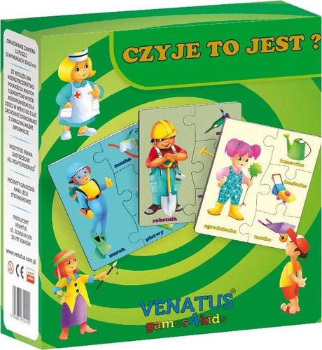 Układanka ma na celu rozwinięcie u dzieci spostrzegawczości oraz kojarzenia jakimi przedmiotami posługują się takie postacie jak: nurek, kominiarz, rolnik, sprzątaczka, ratownik, policjantka, strażak, malarka, pielęgniarka, robotnik, rybak, narciarka.