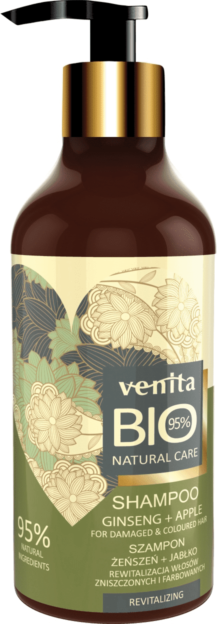 Szampony do włosów Venita. Szampon do włosów Venita BIO o działaniu rewiatalizujacym, przeznaczony do włosów farbowanych i zniszczonych. Formuła wzbogacona o ekstrakty z żeń-szenia i jabłka, które regenerują i wzmacniają strukturę włosów, jednocześnie rewitalizując kolor. Szampon wyprodukowano na łagodnej dla skóry bazie zawierającej 95% składników naturalnych. Nie zawiera siarczanów, silikonów i sztucznych barwników.