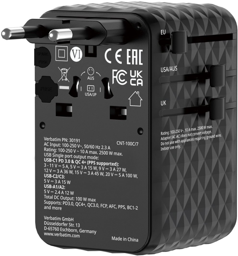 Verbatim Adapter podróżny EU/UK/US GaN 2xUSB-C/2xUSB-A/1xUSB-C PD 100W czarny 30191