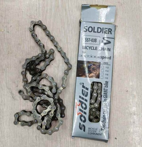 Łańcuch rowerowy S57-03B to nowoczesny produkt przeznaczony do rowerów. Wyróżnia się solidnym wykonaniem i srebrnym kolorem, co zapewnia estetyczny wygląd i trwałość.
