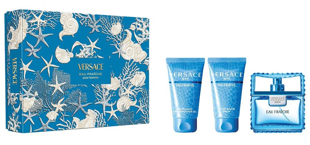 Zestaw Eau Fraiche od marki Versace zawiera wodę toaletową 50ml oraz żel pod prysznic 50ml oraz balsam po goleniu 50ml.