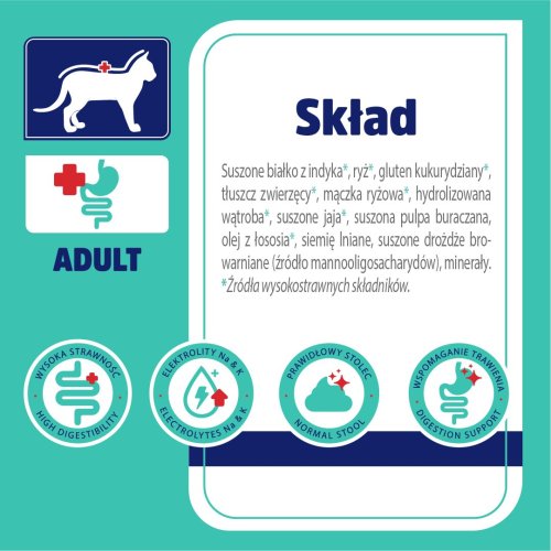 Zawarte w karmie wartościowe białka z lekkostrawnego mięsa indyka, suszonych jaj, ryżu i kukurydzy a także zredukowana ilość tłuszczu, zapewniają kotu posiłek odciążający układ pokarmowy.