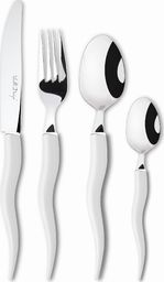 W skład zestawu wchodzi: 1 łyżka obiadowa 1 nóż obiadowy 1 widelec obiadowy 1 łyżeczka do herbaty Stojak Materiał: Antyalergiczna stal nierdzewna, tworzywo Cechy: Ergonomiczne rękojeści Nadają się do codziennego użytku Można myć w zmywarce Produkt posiada certyfikat jakości oraz certyfikat dopuszczający do kontaktu z żywnością