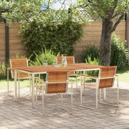 Ten zestaw do jadalni w ogrodzie sprawia, że każda przestrzeń na świeżym powietrzu staje się przytulna. Ma nowoczesny design, świetnie pasujący do zewnętrznych przestrzeni. Dzięki średniemu rozmiarowi i eleganckiemu stylowi, jest idealny na posiłki lub spotkania, wygodnie pomieszczając do czterech osób, by cieszyć się wspólnym jedzeniem na dworze.