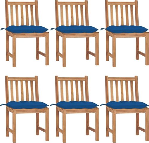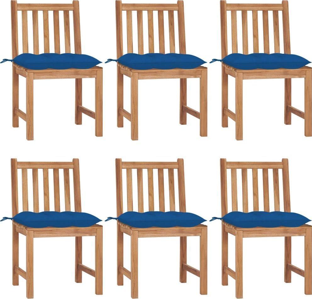 Kolor poduszki: niebieski Materiał: drobno szlifowane, twarde drewno tekowe z wykończeniem na bazie wody Materiał poduszki: tkanina (100% poliester) Wymiary: 50 x 53 x 90 cm (szer. x gł. x wys.) Szerokość siedziska: 50 cm Głębokość siedziska: 43 cm Wysokość siedziska nad ziemią: 45 cm Wymiary poduszki: 50 x 50 x 7 cm (dł. x szer. x gr.) Do użytku zarówno w pomieszczeniach, jak i na zewnątrz Wymagany montaż: tak Zawartość przesyłki: 6 x krzesło 6 x poduszka