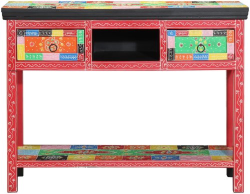 Ten stół konsolowy to połączenie praktyczności i artystycznego stylu, które będzie świetnym dodatkiem do każdej przestrzeni. Jasne czerwone i wielokolorowe akcenty ożywiają wejścia lub salony, tworząc imponującą prezentację dla twojego wnętrza.
