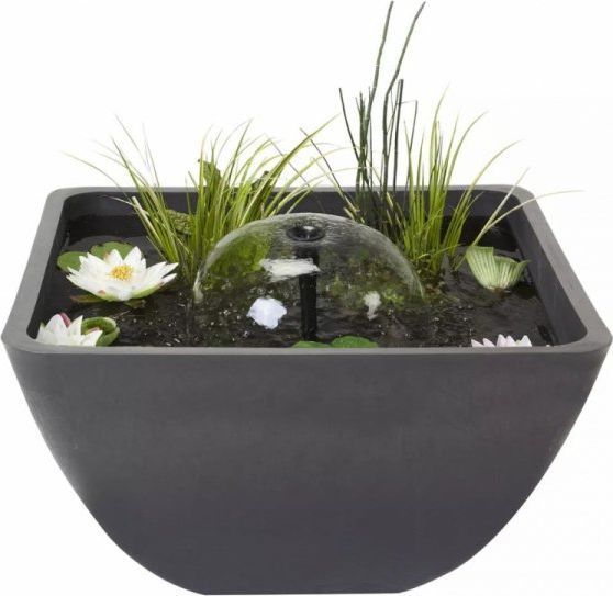 Ten mały staw można ustawić wszędzie: w ogrodzie, patio czy w domu i na balkonie. Pompa fontanny i kosz z roślinami są załączone w przesyłce.