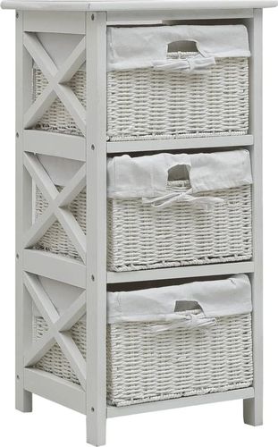 Kolor: biały Materiał: drewno paulowni, tkanina (50% poliester, 50% bawełna) Wymiary: 36 x 37 x 76,5 cm (szer. x gł. x wys.) Zawiera 3 składane, ręcznie wyplatane kosze Wymagany montaż: tak