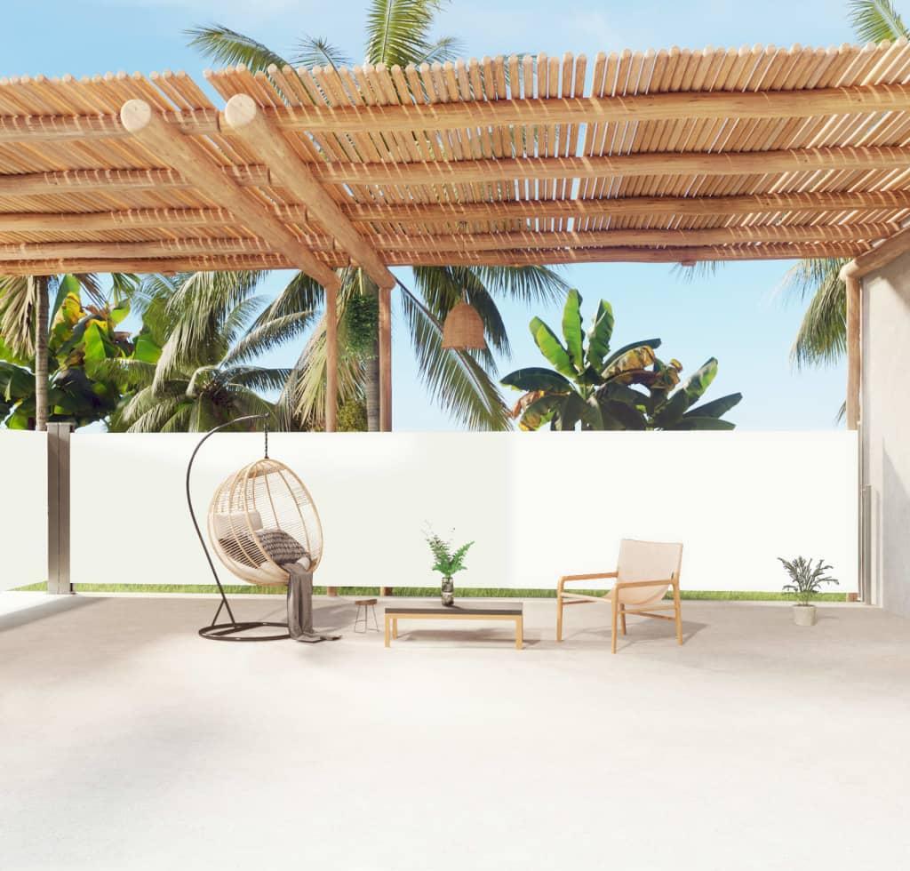 Ta ogrodowa markiza boczna o dużej powierzchni stanowi skuteczny sposób na rozprawienie się z ciągłym wiatrem i nisko położonym słońcem oraz zapewnienie sobie prywatności.