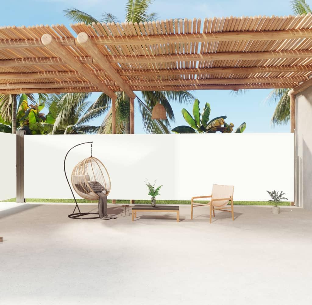 Ta ogrodowa markiza boczna o dużej powierzchni stanowi skuteczny sposób na rozprawienie się z ciągłym wiatrem i nisko położonym słońcem oraz zapewnienie sobie prywatności.